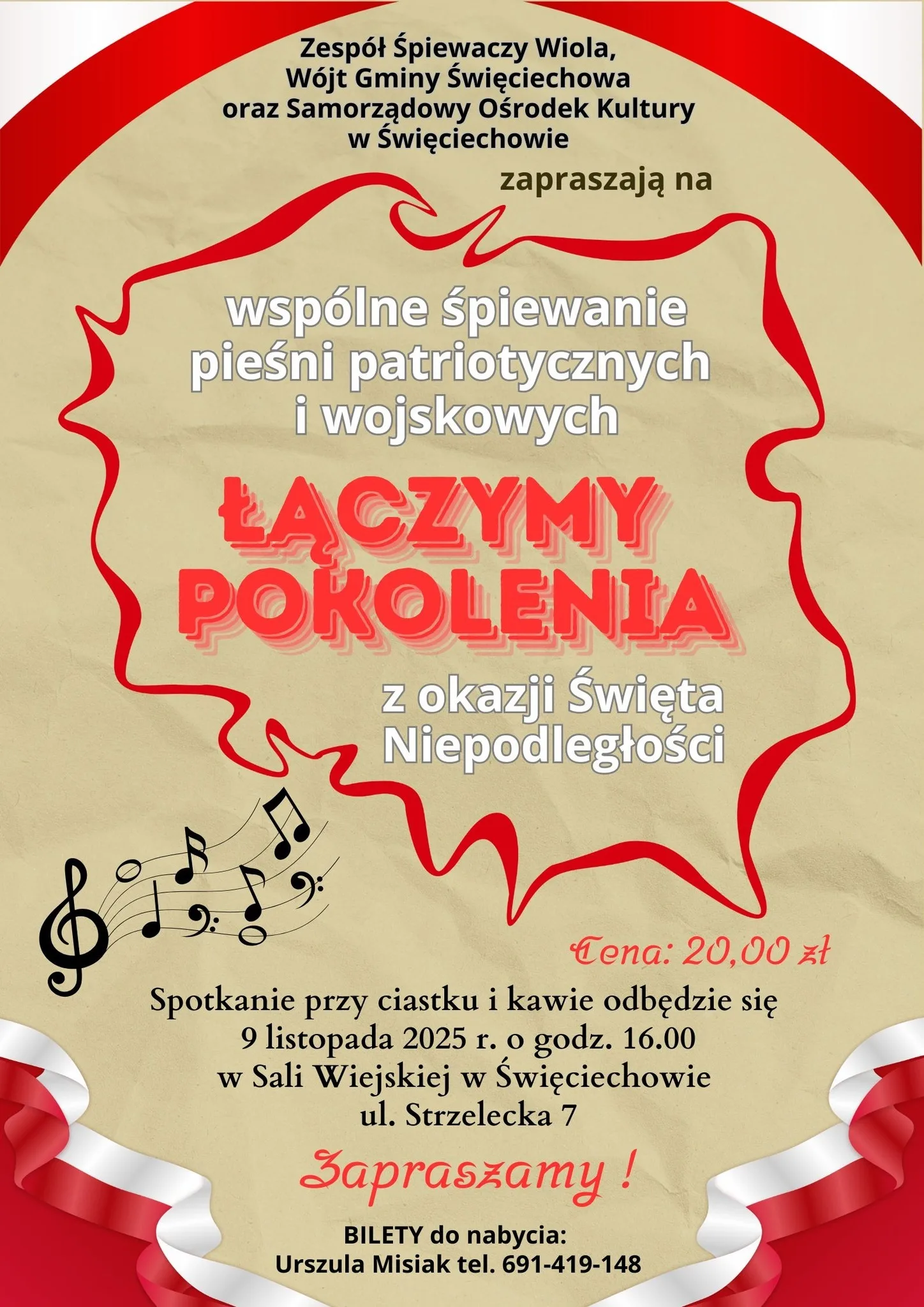 Zespół Śpiewaczy „Wiola”, Wójt Gminy Święciechowa oraz Samorządowy Ośrodek Kultury w Święciechowie serdecznie zapraszają mieszkańców na wyjątkowe spotkanie z okazji Święta Niepodległości.