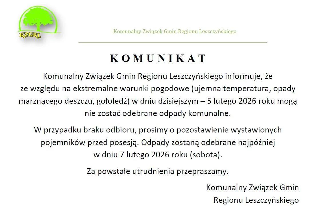 Komunalny Związek Gmin Regionu Leszczyńskiego informuje, że ze względu na ekstremalne warunki pogodowe (ujemna temperatura, opady marznącego deszczu, gołoledź) w dniu dzisiejszym – 5 lutego 2026 roku mogą nie zostać odebrane odpady komunalne.