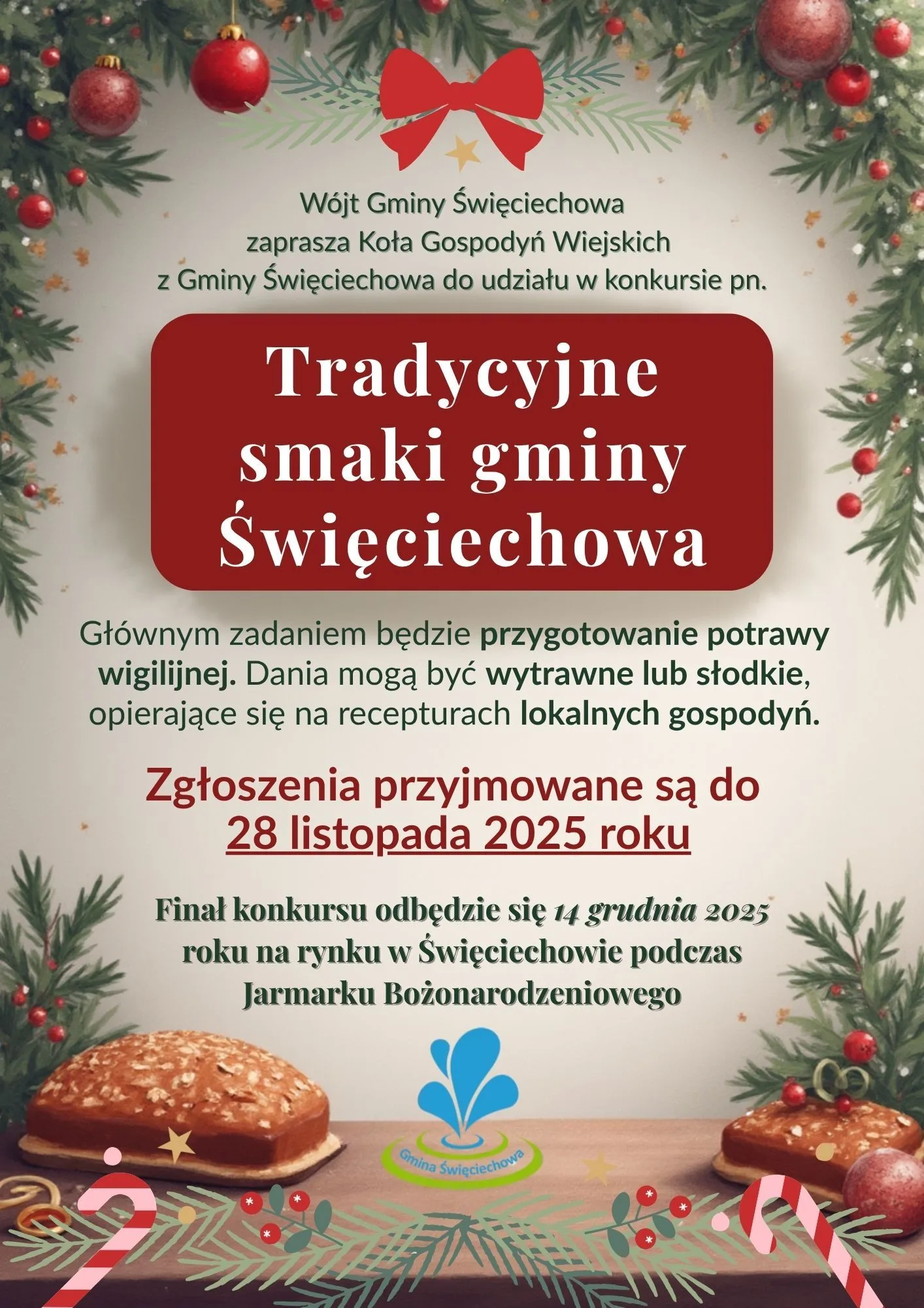 Wójt Gminy Święciechowa zaprasza Koła Gospodyń Wiejskich działające na terenie gminy do udziału w konkursie na świąteczną potrawę pod nazwą „Tradycyjne smaki gminy Święciechowa”.
