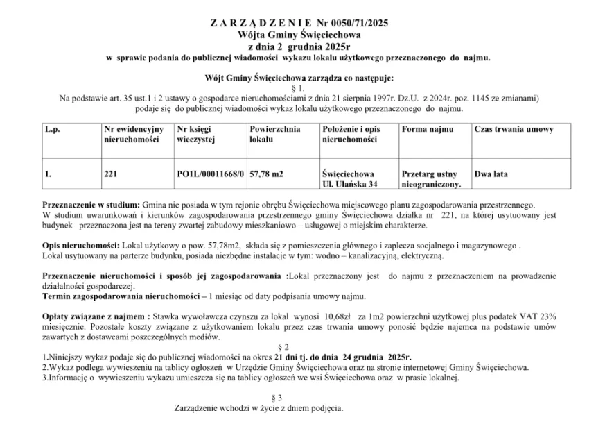 Zarądzenie nr 0050/71/2025 Wójta Gminy Święciechowa w sprawie podania do publicznej wiadomości wykazu lokalu użytkowego przeznaczonego do najmu.