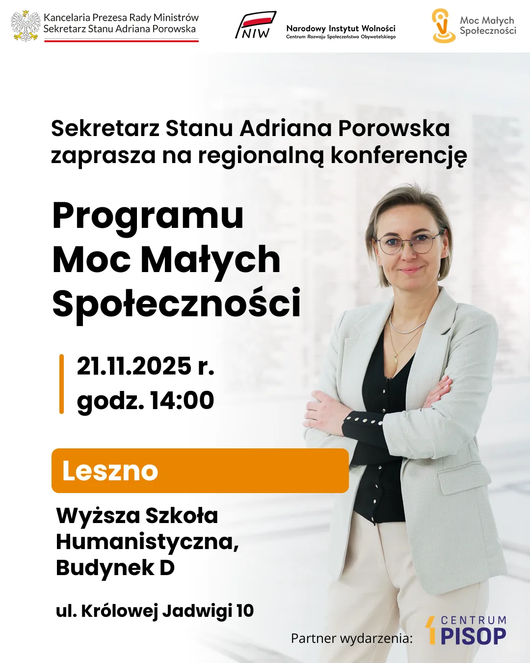 W imieniu Sekretarz Stanu ds. Społeczeństwa Obywatelskiego Adriany Porowskiej zapraszamy mieszkańców gminy Święciechowa do udziału w Regionalnej Konferencji Programu Moc Małych Społeczności, która odbędzie się w Lesznie. Wydarzenie będzie okazją do omówienia doświadczeń z lokalnych działań, zaprezentowania efektów projektów oraz wymiany praktyk między realizatorami.