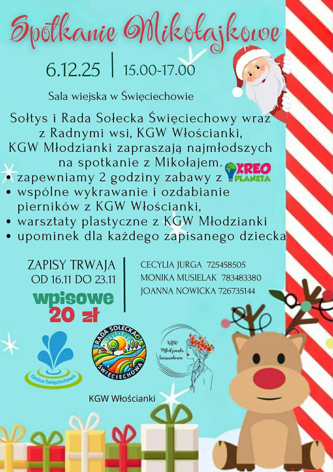 6 grudnia w godzinach 15:00–17:00 w sali wiejskiej w Święciechowie odbędzie się Spotkanie Mikołajkowe organizowane przez Sołtysa i Radę Sołecką wraz z KGW Włościanki, KGW Młodzianki oraz Radnymi wsi. Wydarzenie skierowane jest do najmłodszych mieszkańców.
