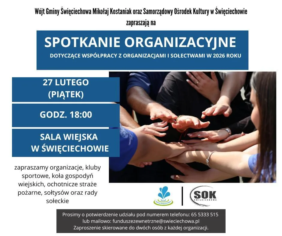 Gmina Święciechowa serdecznie zaprasza wszystkie organizacje pozarządowe na spotkanie organizacyjne, którego celem jest omówienie planów współpracy na rok 2026.