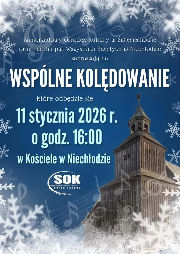 Samorządowy Ośrodek Kultury w Święciechowie oraz Parafia pw. Wszystkich Świętych w Niechłodzie zapraszają na Wspólne Kolędowanie, które odbędzie się w dniu 11 stycznia 2026 roku o godz. 16:00 w Kościele w Niechłodzie.